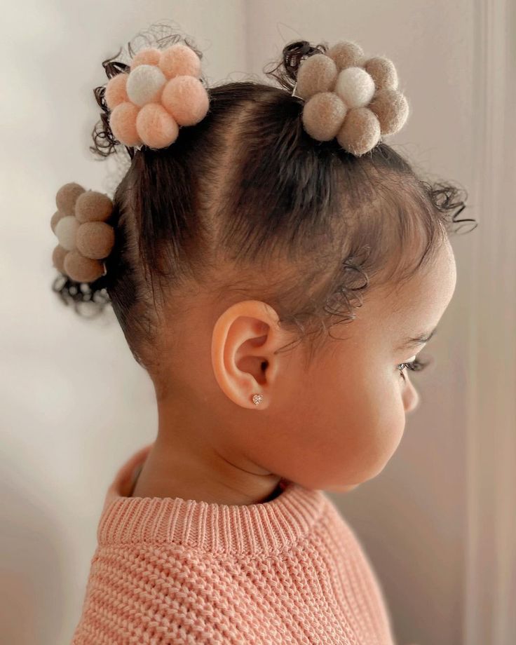 Double puffs adorned with soft floral pom-poms are a playful and versatile style for black kids or toddlers with curly hair. This hairstyle not only keeps hair out of the way but also enhances natural curls, making it a go-to for birthday parties or casual outings.