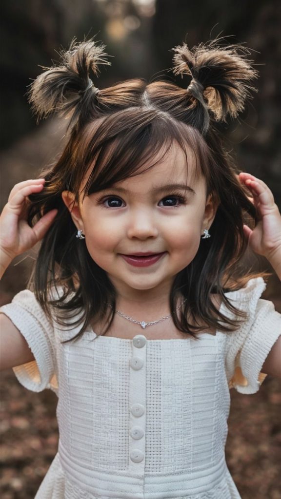 For those who love a natural, laid-back look, this hairstyle combines effortless charm with practicality. Mini ponytails are tied on either side of the head, with soft, wispy strands left out for a relaxed feel. Neutral-toned clips elevate the look, making it suitable for casual outings or family photoshoots.