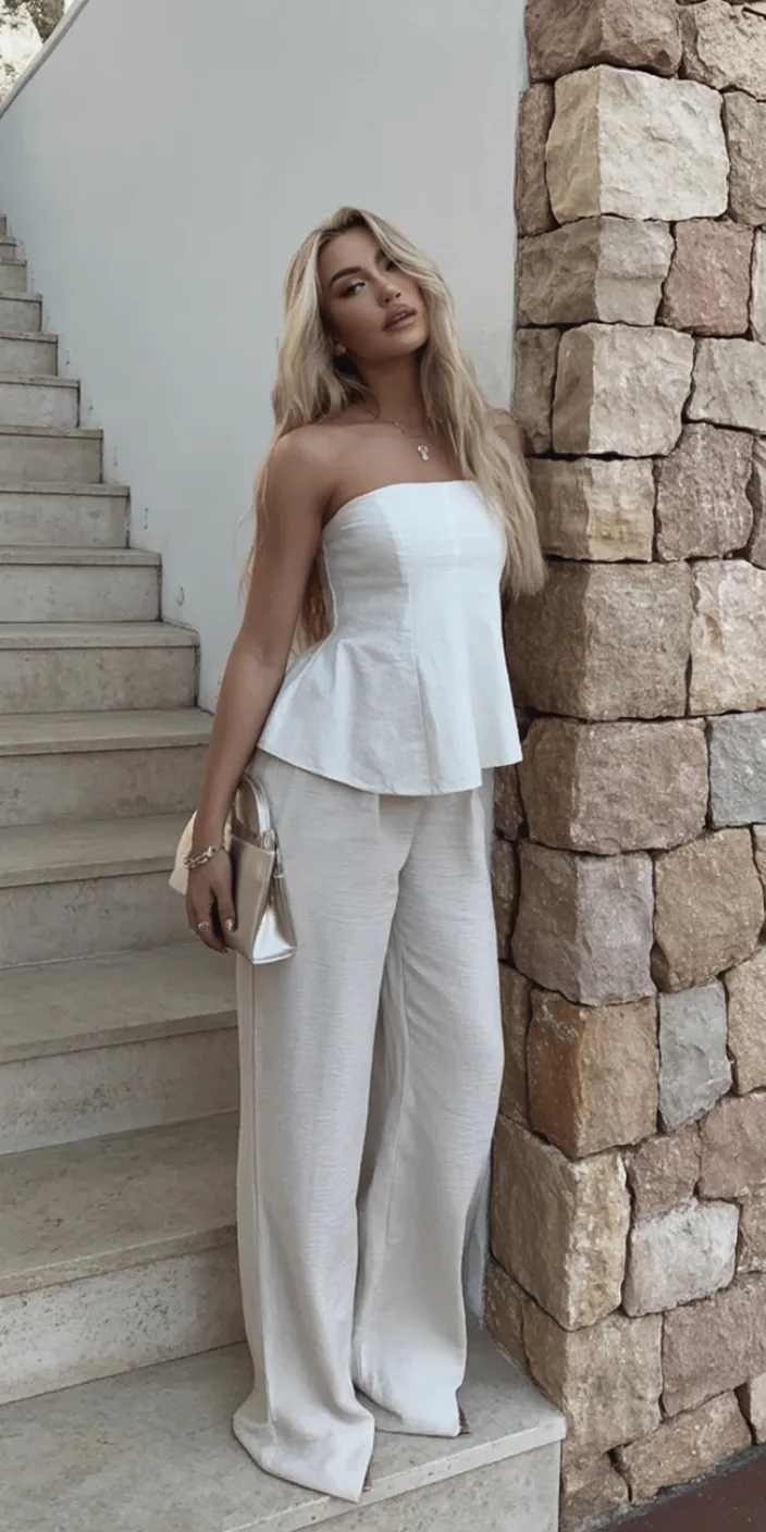 Some outfits whisper luxury instead of shouting it, and this one absolutely knows the power of that approach. The soft white peplum top with matching wide-leg trousers feels elegant, feminine, and a little dreamy in the best possible way. It gives that clean, glowing euro summer mood that looks just as right at a coastal dinner as it does at a rooftop cocktail hour. There is a calm confidence here, the kind that comes from wearing something simple that fits beautifully. It is graceful, refined, and undeniably Classy, with that airy aesthetic that makes you feel instantly more composed the second you slip it on.