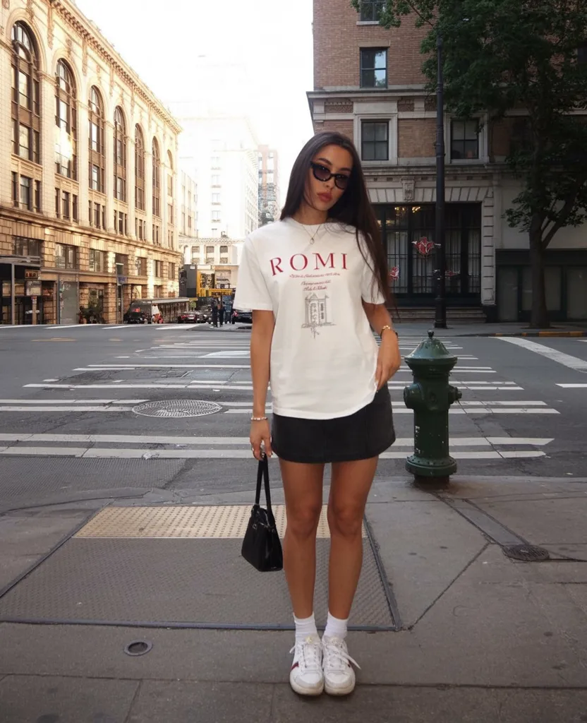 The best part is the low-maintenance factor. You do not need complicated styling here at all. A loose tee gives comfort and coverage, while the mini keeps the silhouette balanced and leg-lengthening. This formula can work for petite, athletic, and midsize builds, especially if you choose a skirt with a clean, straight shape rather than one that clings too tightly. White Sneakers and socks make it practical for daytime walking, and a small shoulder bag adds just enough polish. It is one of those casual Ideas that feels fun for 2026 without being trend-dependent.