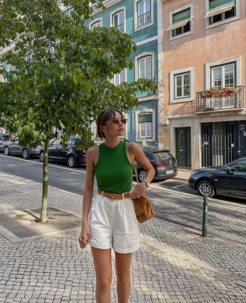 This one is such a good reminder that a simple pop of color can completely wake up a summer wardrobe. The rich green sleeveless top brings freshness and personality, while the crisp white tailored Shorts keep the whole thing looking clean and elevated. It feels lively, smart, and a little more fashion-aware than the usual tank-and-shorts combo. There is something very appealing about an outfit that looks relaxed but still pulled together enough for lunch, shopping, or a long city walk. It has that bright euro summer spirit without needing prints, layers, or a lot of accessories to make the point.
