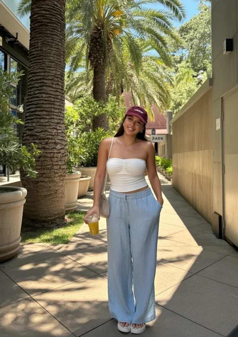 This outfit has that cool, sun-soaked energy you reach for when the day is hot and your mood is firmly set on easy. The fitted white bandeau top keeps the look clean and minimal, while the pale blue wide-leg trousers soften everything with movement and a little vacation elegance. Then the cap comes in and changes the whole mood, making it feel sporty, laid-back, and just the right amount of playful. It is the kind of look that says you care about style, but not enough to spend an hour fussing over it. Clean lines, soft color, and easy comfort? That combination is always a win for aesthetic 2026 dressing.