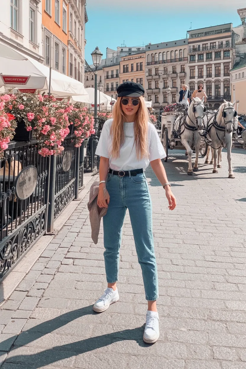 This outfit is especially good for Women who want a reliable daytime look that works for city walks, travel days, or long lunches without sacrificing style. Straight or slightly tapered jeans keep the shape neat, while the tucked-in tee and belt define the waist in a flattering way for midsize and Plus size figures too. Add Sneakers for comfort, a structured cap for personality, and simple sunglasses for that Chic finish. What makes it special is how easy it is to recreate with pieces you may already own, while still giving real euro summer Inspo 2026 energy.