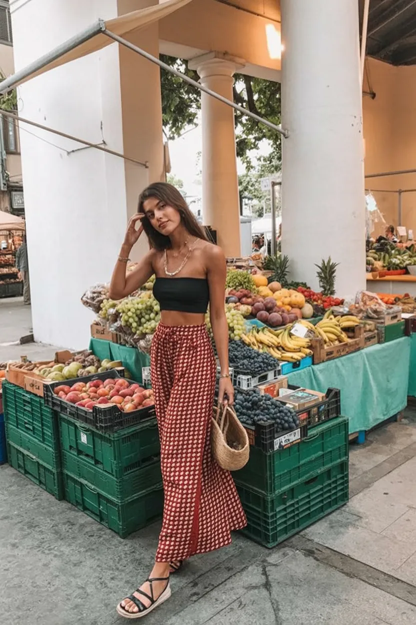 This look has that delicious just-back-from-the-market feeling that makes euro summer style so irresistible. The bandeau top keeps things sleek and sun-ready, while those flowing printed pants bring movement, personality, and a little bit of wanderlust. It feels warm, spontaneous, and just a touch flirty without trying too hard. You can almost imagine wearing this after picking up fresh fruit, stopping for an iced coffee, and drifting through an old town before the afternoon heat rolls in. The pattern adds a Colorful twist without becoming loud, and the whole outfit lands in that sweet spot between beach ease and polished vacation aesthetic.