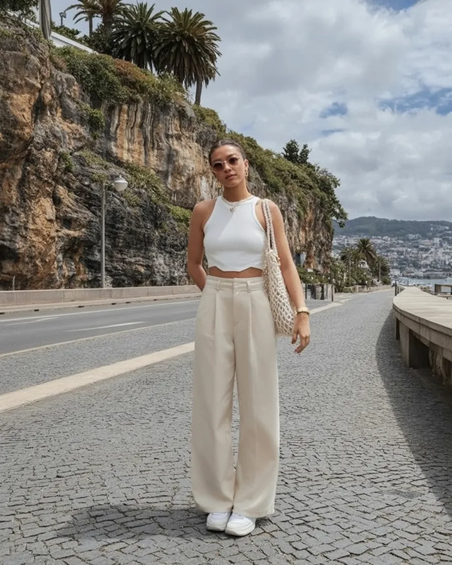 Right now, tailored wide-leg trousers are one of the strongest euro summer trends because they make even the most minimal outfit look elevated. This combination works well for petite frames if the hem is adjusted, and it is equally flattering for taller Women because the long line feels elegant and elongating. White Sneakers make it more wearable for daytime exploring, while a woven shoulder bag keeps the look soft and beach-adjacent. It is a smart choice for travel because every piece can mix with other staples, giving you more Ideas with less packing.