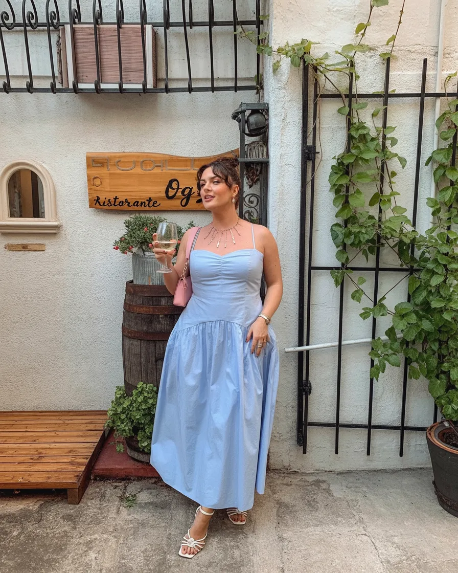 What to wear it with? Keep the accessories simple and let the skirt have its moment. A fitted white tube top or tank keeps the balance right, while flat sandals or espadrilles work beautifully for sightseeing or lunch by the water. This shape is lovely for straight, pear, and hourglass figures because the full skirt adds softness without clinging. For Greece vacations, beach dinners, or just bold Inspo 2026, this feels fresher and more memorable than many standard dresses. It gives that full euro summer fantasy in a way that still feels very wearable.