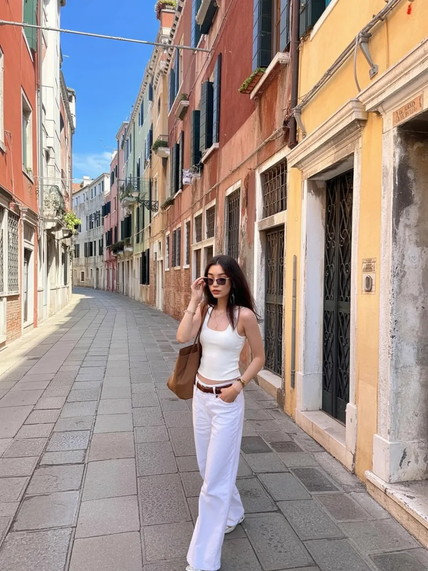 Some outfits are quiet, but they still leave a strong impression, and this is one of them. A fitted white tank with white trousers sounds simple, yet on a sunlit European street it suddenly feels impossibly Chic. The brown belt and bag add warmth, structure, and just enough contrast to keep the look from feeling flat. It has that confident, pared-back elegance that often looks the most expensive because nothing is fighting for attention. This is the kind of outfit that feels grown, polished, and effortless all at once, like you have mastered the art of looking refined with only a handful of well-chosen pieces.
