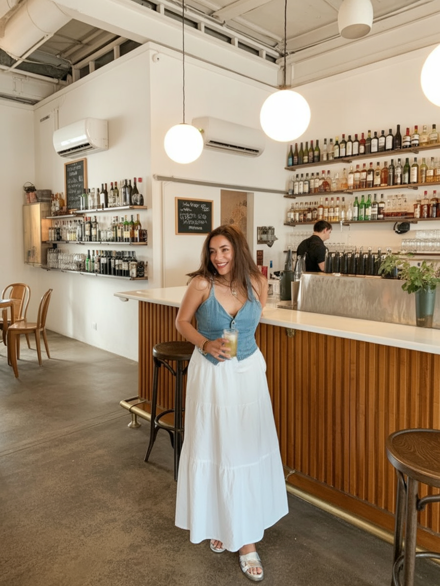This look is laughter over drinks, easy conversation, and a spontaneous evening. The flowy white skirt adds a touch of ease and elegance, while the fitted top keeps everything balanced and flattering.