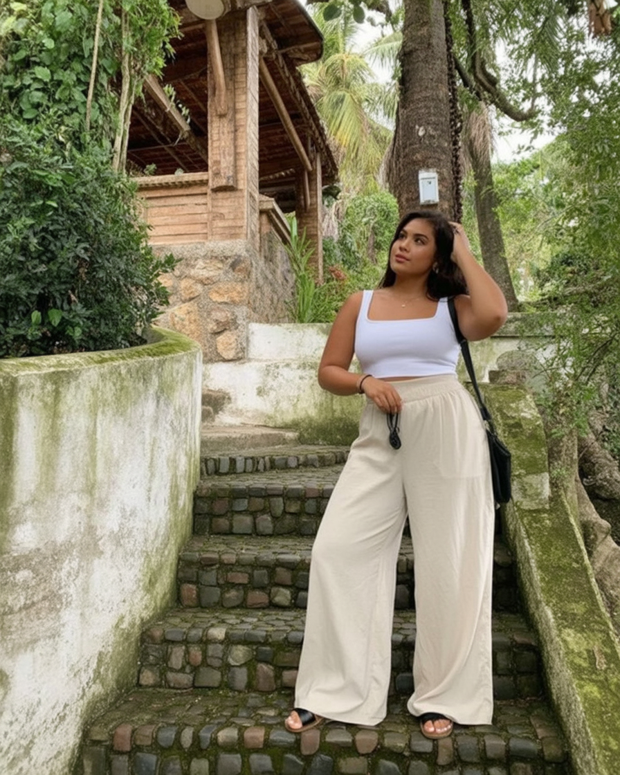 This outfit works beautifully for women who love light layers and subtle contrast. It’s especially flattering for midsize and plus-size bodies because the gentle drape skims rather than clings. Style it with sneakers or comfortable walking shoes to keep things practical, especially for travel days when you’re on your feet from morning to night.