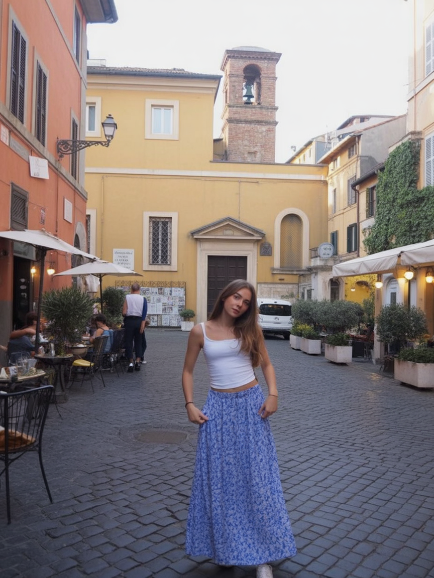 This look feels like a slow afternoon in Italy, where time stretches and style feels instinctive. The soft blue skirt brings movement and charm, while the simple top keeps everything grounded and fresh. It’s feminine without trying too hard, capturing that relaxed aesthetic that makes European spring outfits so inspiring.