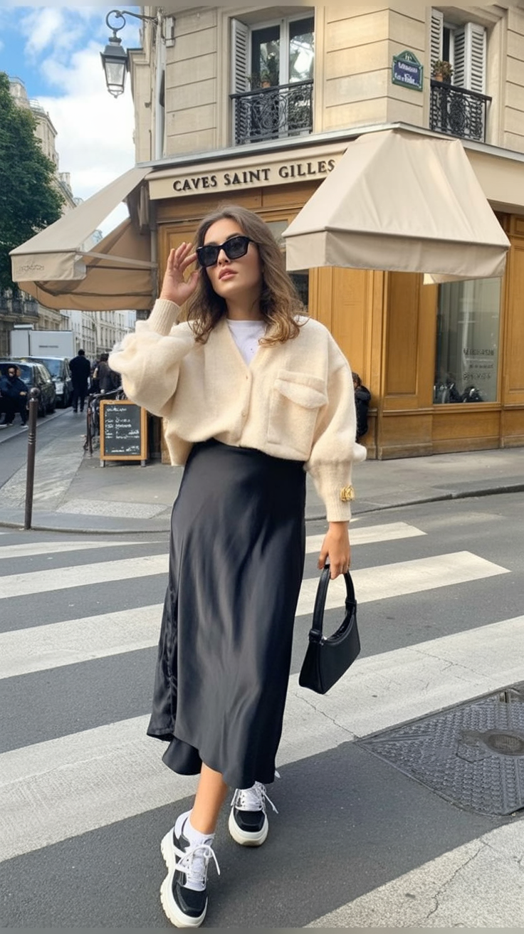 There’s something quietly powerful about this look—it feels like the kind of outfit you throw on without overthinking, yet it turns heads anyway. The soft cardigan paired with a fluid skirt has that effortless European street-style energy, the kind that feels confident but never loud. It’s polished enough for a café meeting, relaxed enough for wandering side streets, and perfectly balanced between feminine and cool.