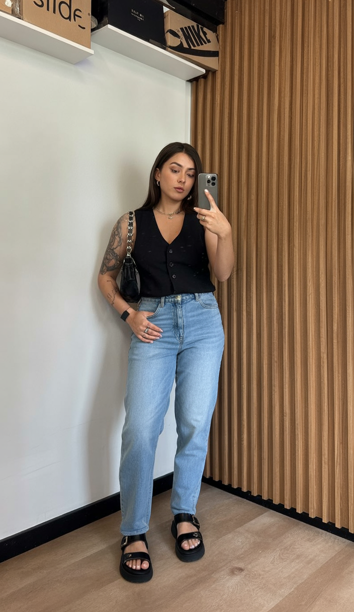 It’s this no-nonsense confidence; it always feels now. The tight top and jeans make for a strong shape that’s grounded, practical, and quietly stylish. It’s the look you grab when you want to look put-together but also feel good at the same time.