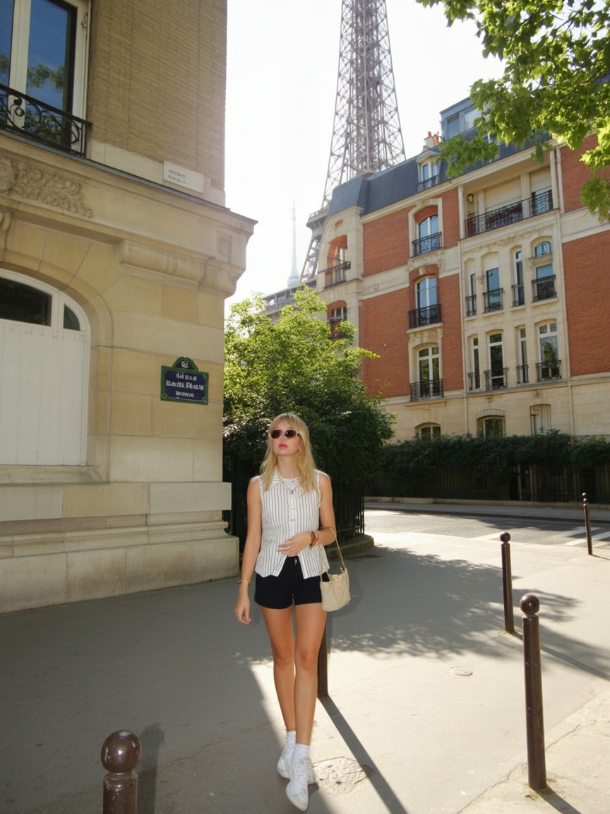 There’s a light, fun feeling going on here that is just perfect in the city for early spring. Sleeveless top and shorts combine to create something lighthearted—you’re leaning into sunshine even though a little chill remains in the air.