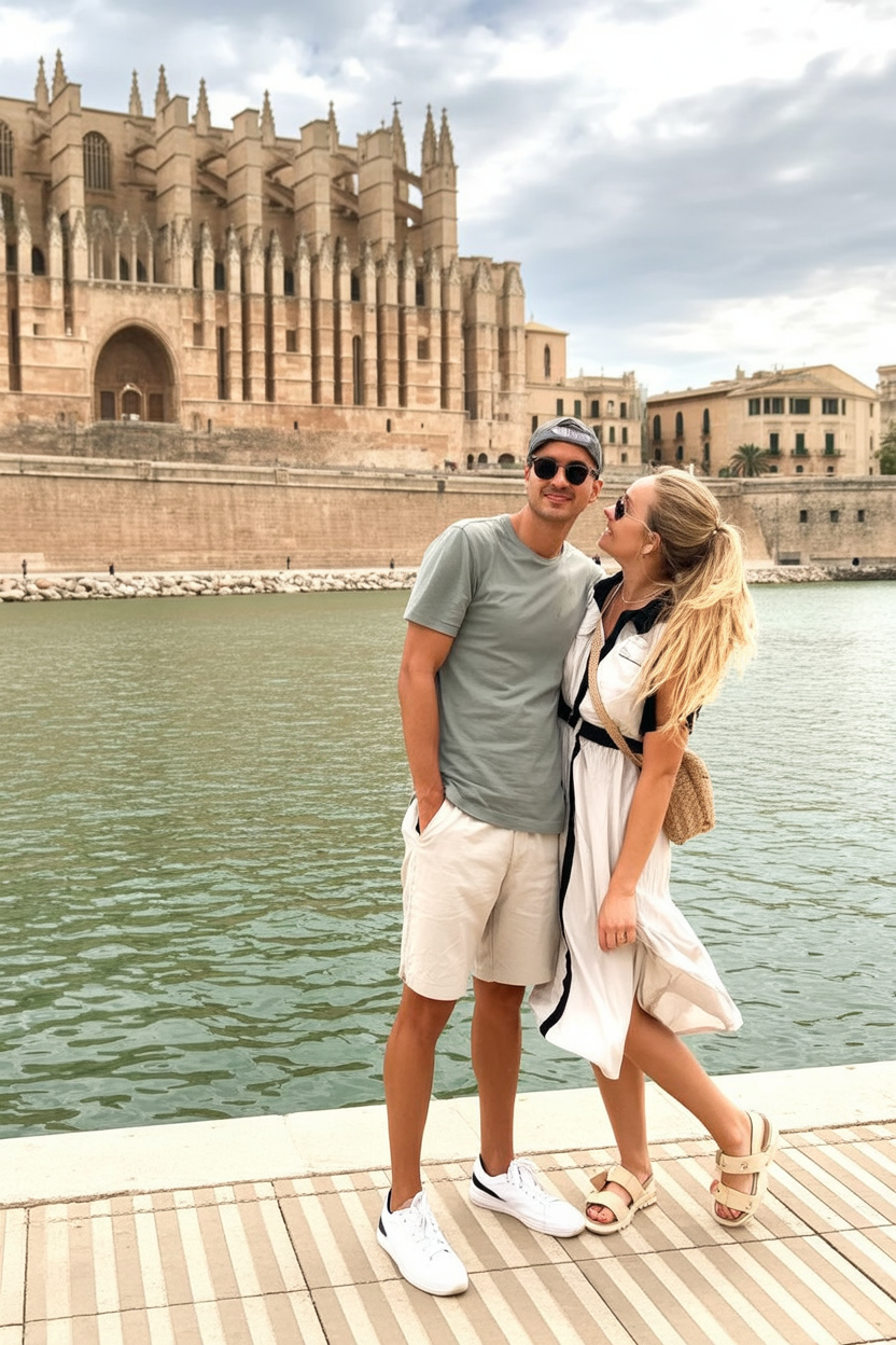 There’s just something undeniably charming about this look—it’s effortless, it’s relaxed, and it’s real. The flowy dress and easy sandals give a vacation vibe that’s more earthy than styled—perfect for wandering historic streets or waterfront paths together.