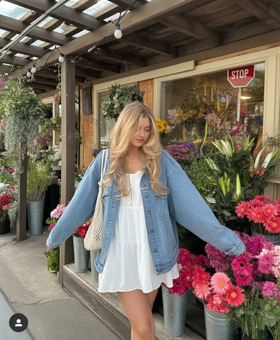 If an outfit was akin to Flower Market wandering, no place to be…and all day long. The breezy white dress with an oversize denim jacket is laid-back and romantic; playful, not precious. It’s youthful and breezy, and brimming with that easy Europe-in-spring charm that never overdoes it.