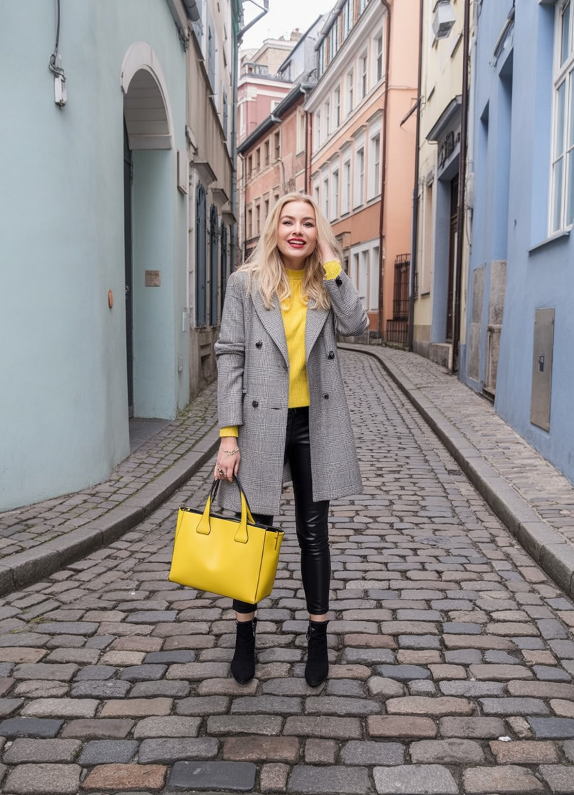 Color doesn’t have to be over the top; this outfit proves that it can make a statement in a soft-spoken kind of way. The pop of yellow against neutral layers is equal parts vibrant and confident, a little bit bold—in the best way. It’s the sort of look that makes gray streets seem lighter.