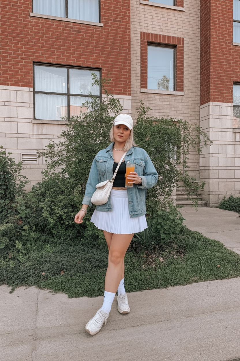 This outfit fuses style and comfort with what feels distinctly now. The pleated skirt gives movement and pretty factor, but the denim jacket and cap ground it in sporty reality. It’s casual, accessible, and made for everyday city life.