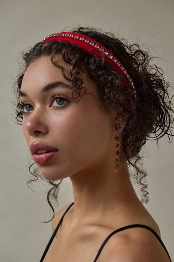This elegant curly updo is perfect for a sophisticated fall look. The hairstyle features loose curls gathered at the nape of the neck, creating a voluminous and textured updo. The addition of a red, jewel-encrusted headband adds a touch of glamour, making it ideal for both casual outings and formal events. This style is especially flattering for black women, highlighting natural curls and adding a chic, polished finish.