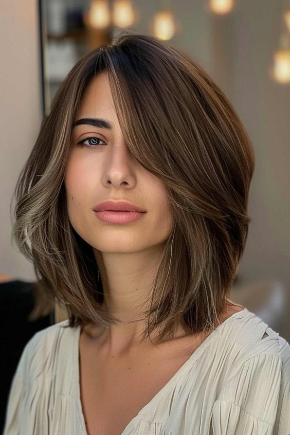 This layered bob with side-swept bangs is a sophisticated and modern hairstyle perfect for fall. The layers add movement and volume, while the side-swept bangs frame the face beautifully. This style is ideal for women in their 40s and 50s, offering a chic and youthful look.