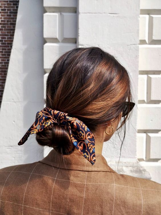 A low bun tied with a colorful scarf is a chic and sophisticated hairstyle. The scarf adds a pop of color and interest, making it a stylish choice for fall. This hairstyle is perfect for women over 50 looking for an elegant and easy-to-achieve look.