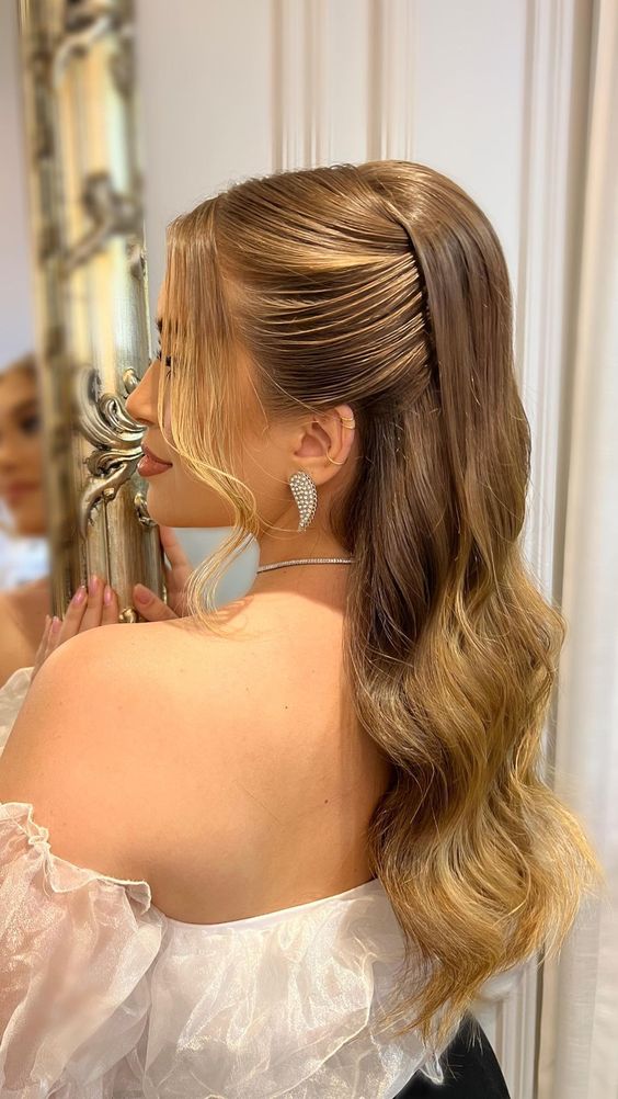 The elegant half-up, half-down hairstyle is perfect for formal occasions. The top half of the hair is styled into a sleek, twisted design, while the bottom half flows in soft waves. This style is ideal for fall weddings or parties, offering a glamorous and refined look.