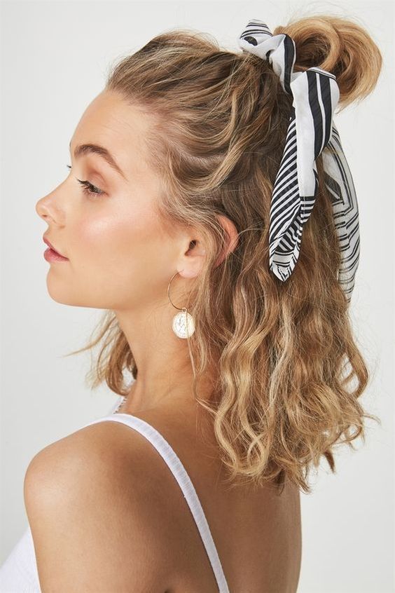 This curly half-up, half-down hairstyle with a scarf is perfect for a relaxed and stylish fall look. The scarf adds a bohemian touch, while the curls provide volume and texture. This style is ideal for women with curly hair, offering a versatile and trendy option for the season.