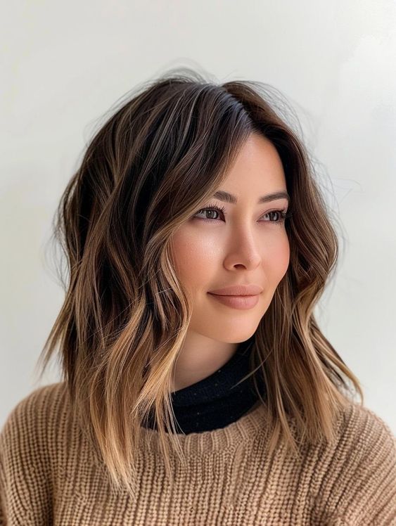 For those looking for a shorter style, this chic wavy bob is a fantastic option. The bob is cut just above the shoulders, with soft waves adding volume and movement. The warm, balayage highlights give the hair dimension and complement the fall season’s earthy tones. This hairstyle is perfect for women over 50 who want a low-maintenance yet fashionable look.