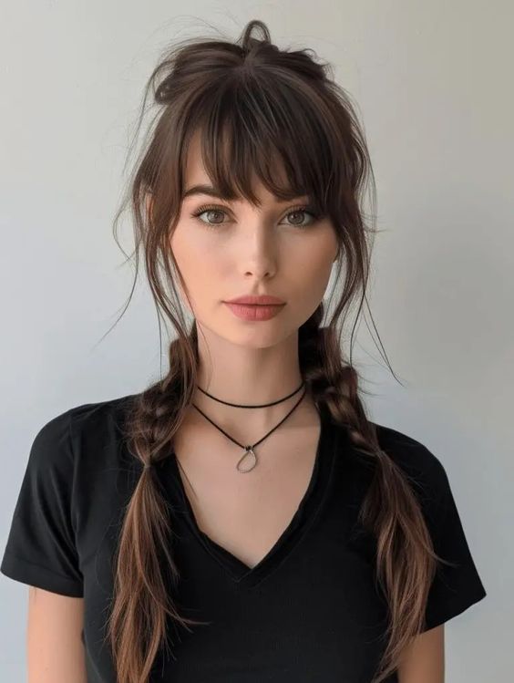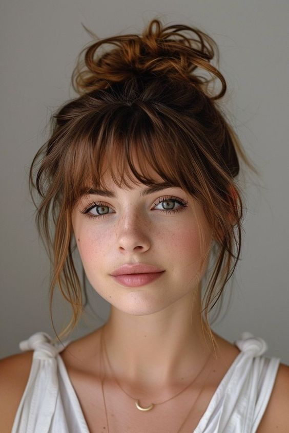 The messy bun with bangs is a timeless hairstyle that never goes out of style. This version features a relaxed bun perched on top of the head, with wispy bangs framing the face. It’s an effortless look that’s perfect for any fall activity, from pumpkin picking to cozying up with a book. This style is particularly flattering for women in their 30s and 40s, adding a youthful and playful touch.
