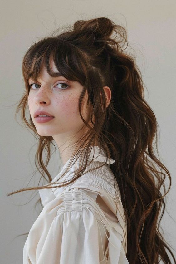 Long, wavy hair styled with a half-up top knot is both trendy and practical. The top knot adds height and interest, while the loose waves create a relaxed and natural look. This hairstyle is great for women with longer hair who want a style that’s easy to manage yet stylish. It’s particularly suitable for fall 2024 women’s hairstyles, offering a balance of sophistication and ease.