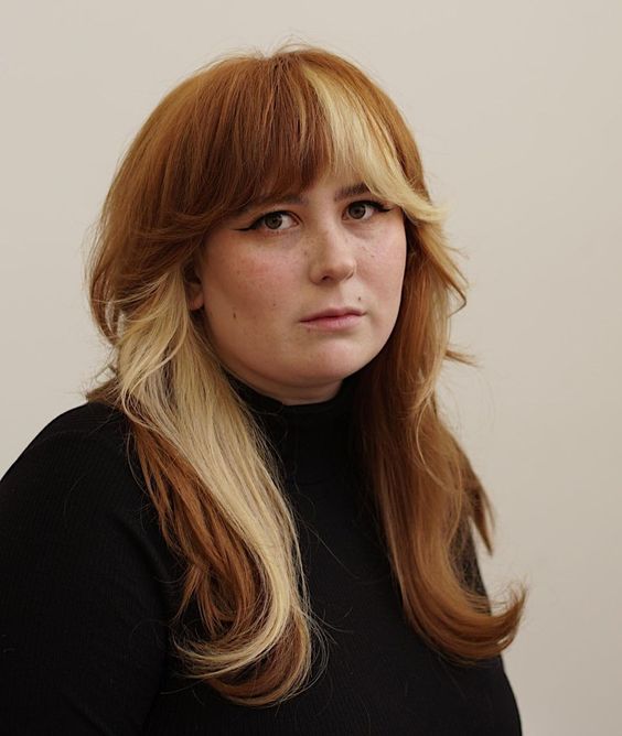 Embrace a retro vibe with this two-tone hairstyle. The hair is styled with a distinct color block, featuring a warm, coppery hue on top and a light, blonde shade underneath. This bold and creative look is perfect for women who want to make a statement with their fall hairstyle. It’s an excellent choice for fall 2024 women’s hairstyles, offering a unique and eye-catching option.