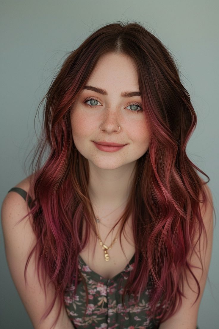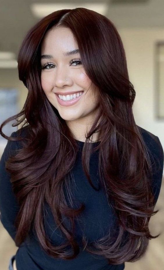 For a bolder look, this burgundy color adds a dramatic touch to brunette hair. The deep red tones in this color are perfect for fall, adding warmth and richness to the hair. This color is ideal for women who want to stand out and make a statement. The long, wavy layers add movement and texture, enhancing the overall look.
