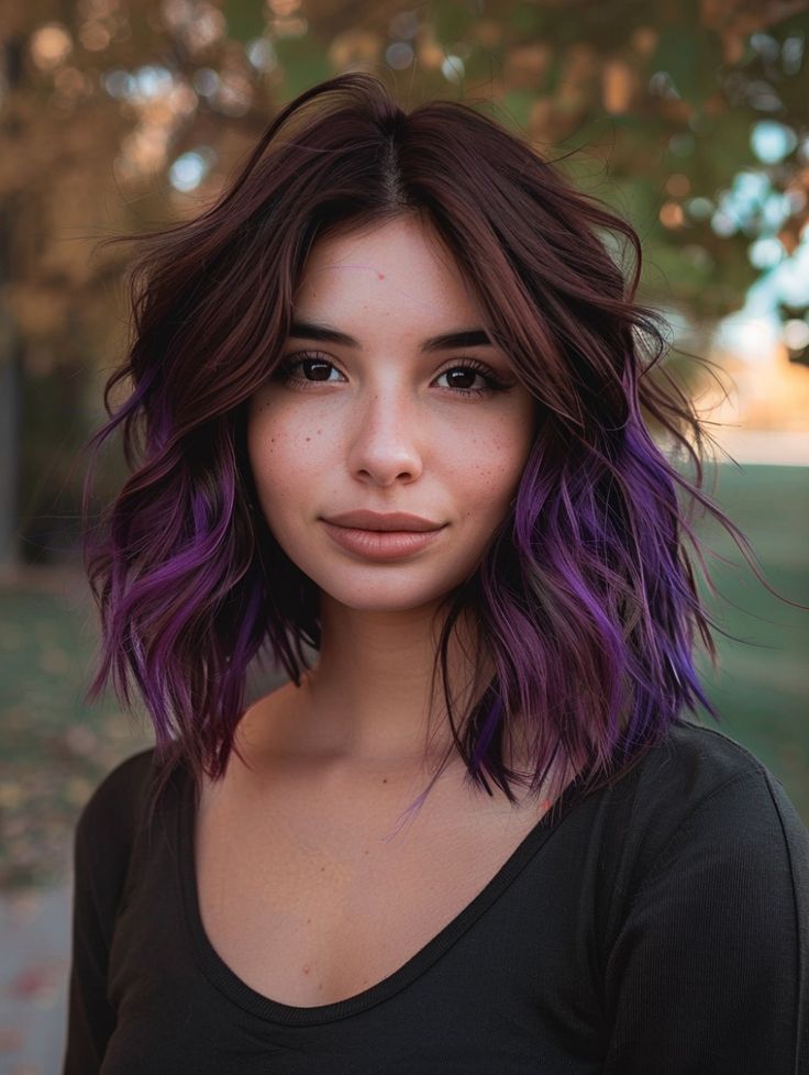 Adding a bold twist to brunette hair, this style features rich plum accents that provide a striking contrast against a dark brown base. The subtle yet vibrant purple tones are perfect for those looking to make a unique statement this fall. This short bob cut with layers adds texture and dimension, making the plum highlights pop even more. The overall effect is both edgy and sophisticated, ideal for fashion-forward women who love experimenting with colors.
