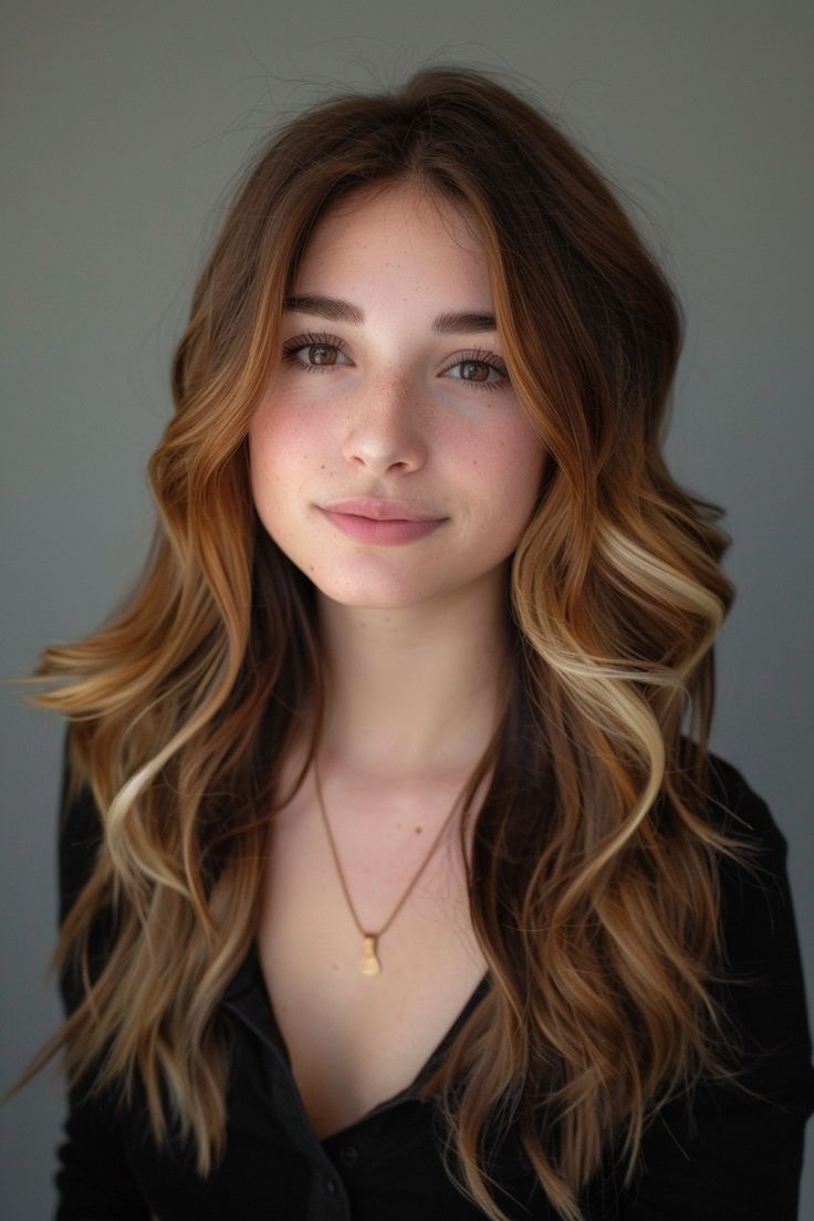 This hairstyle features a light brown base with blonde highlights, creating a soft and natural look. The blonde highlights add brightness and dimension to the hair, making it look fuller and more vibrant. This style is perfect for those who want to add some lightness to their hair without going too blonde. The shoulder-length cut with loose waves adds to the overall appeal, making it a great choice for fall.