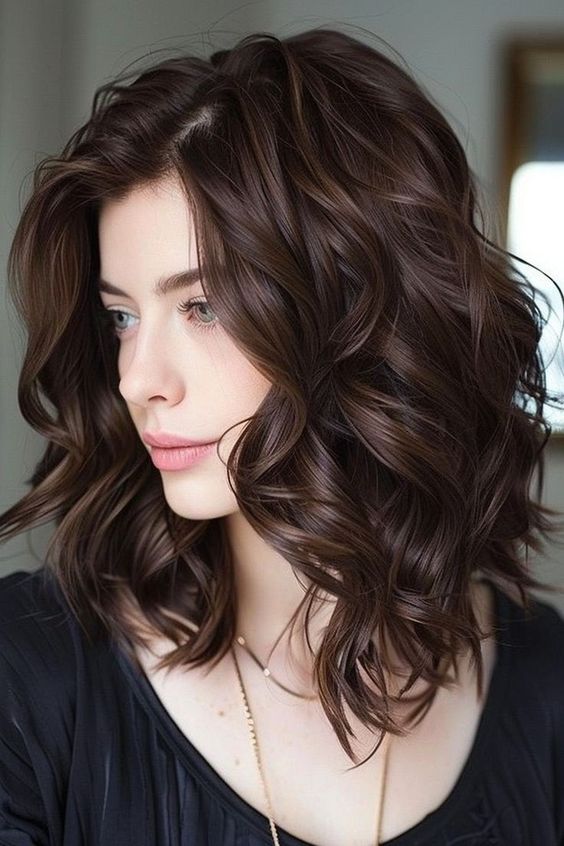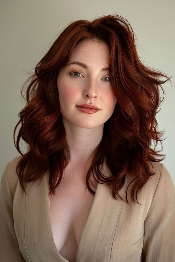 For those looking to add a hint of red to their brunette hair, this subtle copper glow is an excellent choice. The reddish-brown tones in this color add warmth and depth without being overpowering. This color is perfect for fall, as it complements the season’s natural colors. The shoulder-length cut with soft waves enhances the overall look, making it a trendy yet timeless choice.
