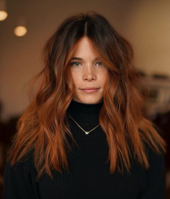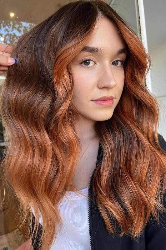 This hairstyle features a stunning copper ombre effect that transitions smoothly from a dark brunette base to vibrant copper ends. The ombre technique adds a touch of boldness to the look, while the long, wavy layers add movement and volume. This style is perfect for those who want to experiment with color while keeping their natural brunette base.