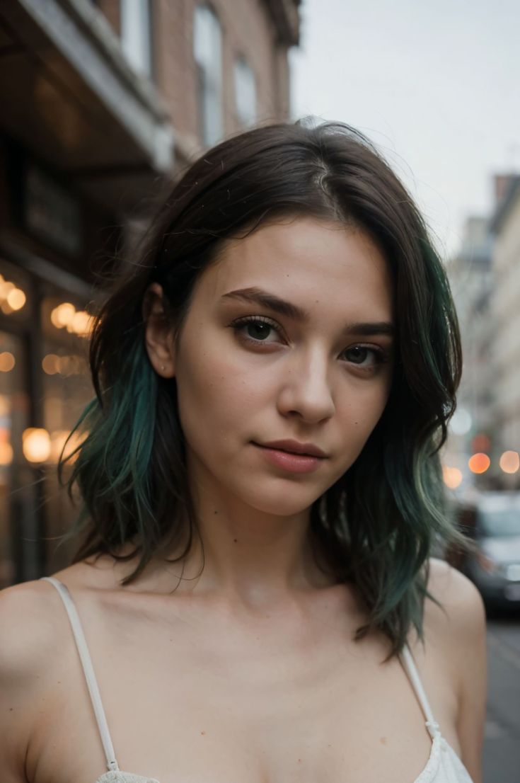 This unique hairstyle features subtle teal ends that add a pop of color to a dark brunette base. The teal tones are blended seamlessly into the hair, creating a striking yet elegant effect. This short cut with layers and waves adds texture and movement, enhancing the overall look. This style is perfect for those who want to experiment with color in a subtle and sophisticated way.
