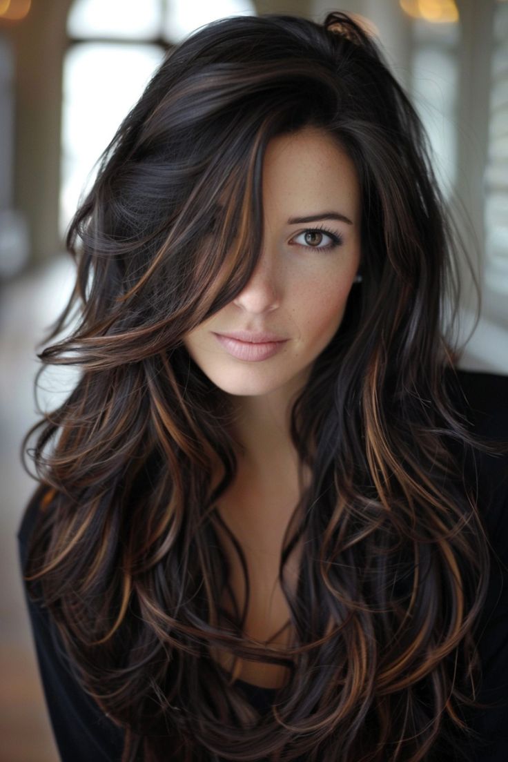 This hairstyle features a dark caramel balayage that adds dimension and warmth to brunette hair. The caramel tones are subtly blended into the darker base, creating a natural and seamless look. This style is perfect for those who want to add some lightness to their hair without going too far from their natural color. The long, wavy layers enhance the overall appeal, making it a great choice for fall.