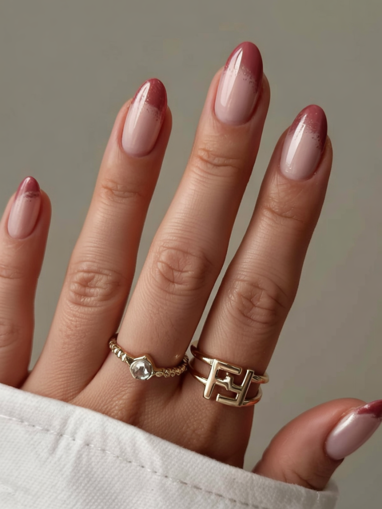 A twist on the classic, this dusty mauve French fade is somehow a soft subtle modern take. The glistening glimmer of glitter on the tips is the slight tint of glow that makes it modern and stylish.