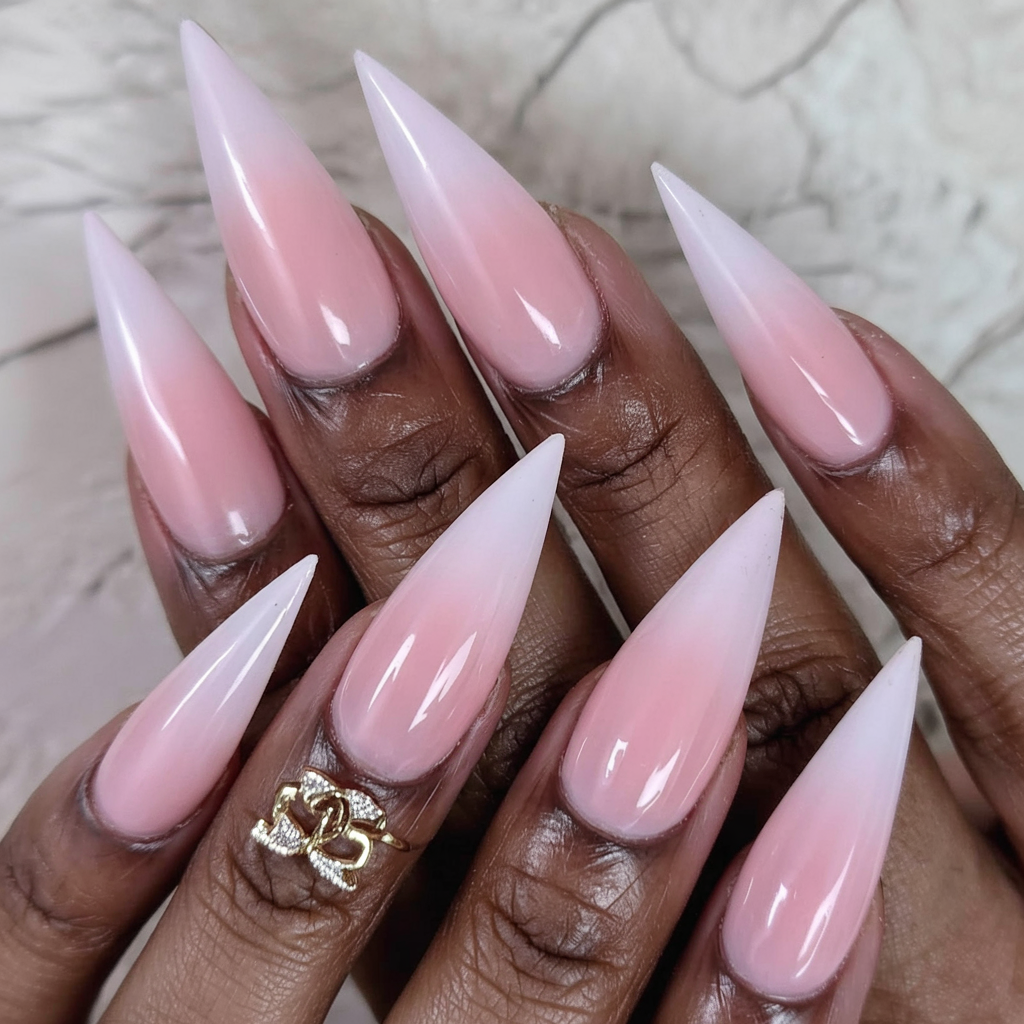 The combination of ombre effect with sharp and extra-long stiletto nails — such a blush-to-white color is sleek, sharp, and fully sophisticated. Feminine, but fierce. Subtle, but striking. These nails don’t ask for attention, they command it.
