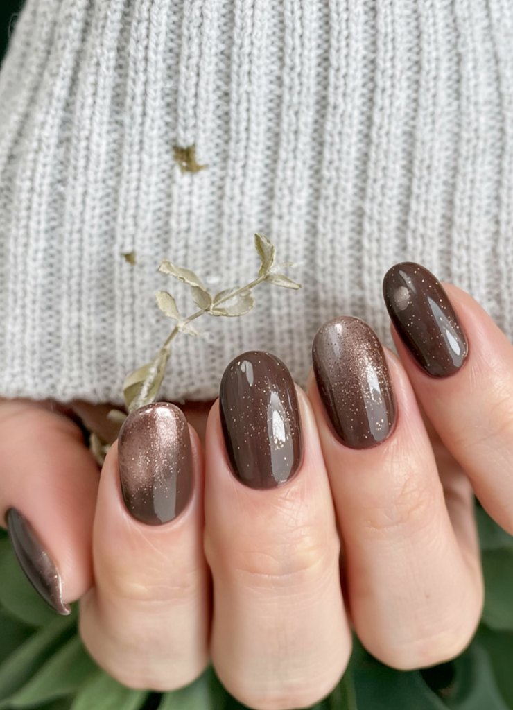 A single look and you will have the urge to order a caramel macchiato It is a cozy autumn manicure in brown. It is edible, comforting, toasty and has a gleaming, almost eatable finish.