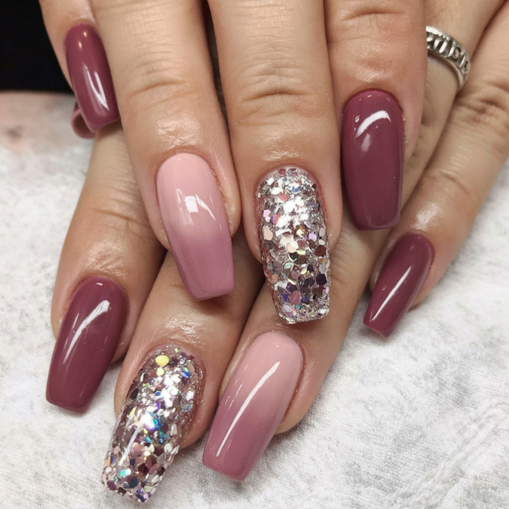 Should you be an ideas burgundy lover who likes to be a little bit more, then wearing this style is like combining shimmer and soft shades. It works particularly well on medium to long square nails and it is a favorite of women that prefer a sprinkle of bling in their autumn palette.
