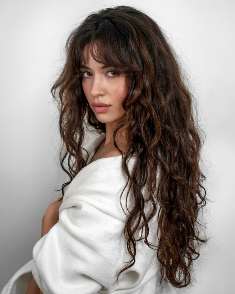 Dreamy and romantic with just the right edge, this long curly shag has a quiet drama that’s impossible to ignore. The fringe adds vintage charm while the cascading layers let your curls live their best life.