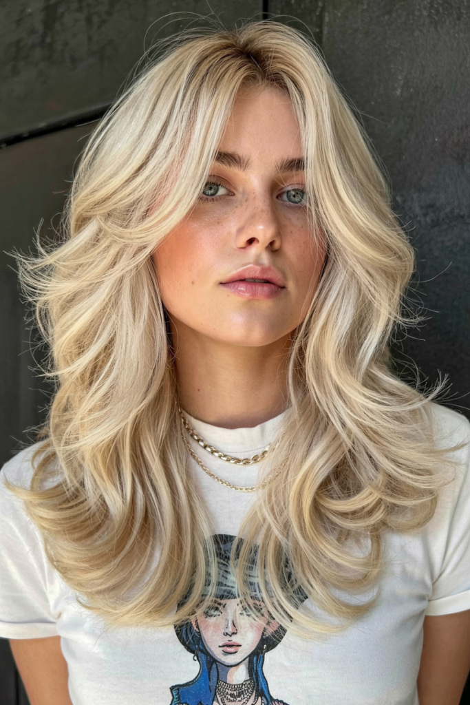 This look is pure fall hair inspo — a voluminous cascade of golden waves that practically glow. The blonde highlights around the face brighten the complexion instantly, and the thick long layers add that just-stepped-out-of-the-salon feel.