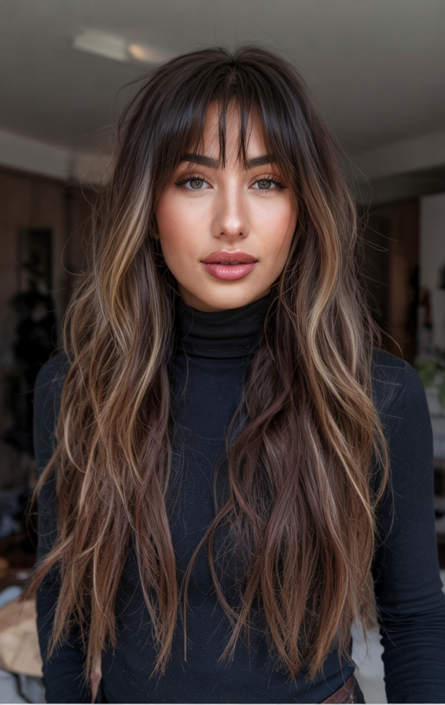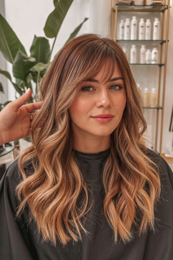 There’s something fresh and quietly powerful about this cut — the kind of look that makes people say, “Did you do something different?” without quite knowing what. The bangs blend seamlessly into the rest of the hair, and those soft ribbons of brunette add incredible depth.