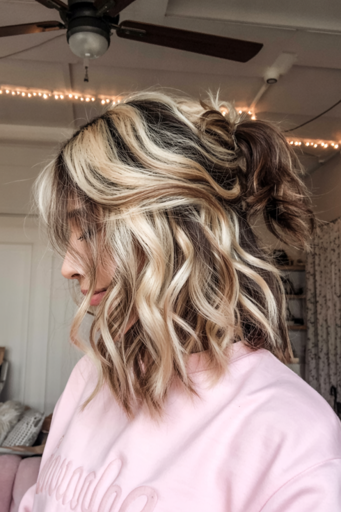 This edgy bob takes curls to a whole new level. With blonde ribbons set against rich chocolate tones, it’s the perfect blend of sweetness and sass. The texture gives it movement, while the half-up styling adds personality and dimension.