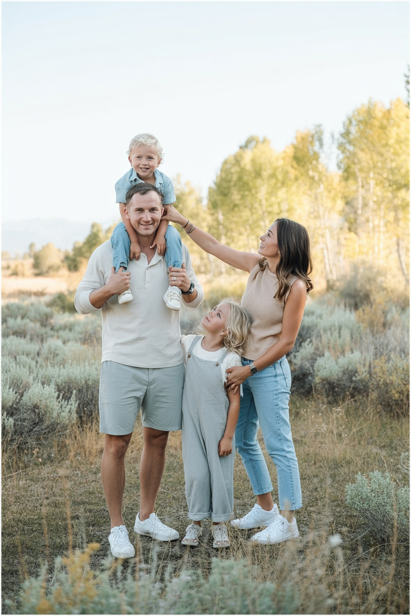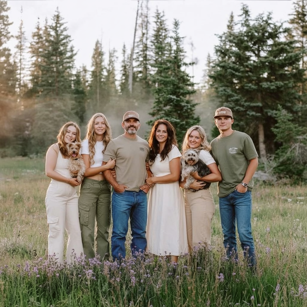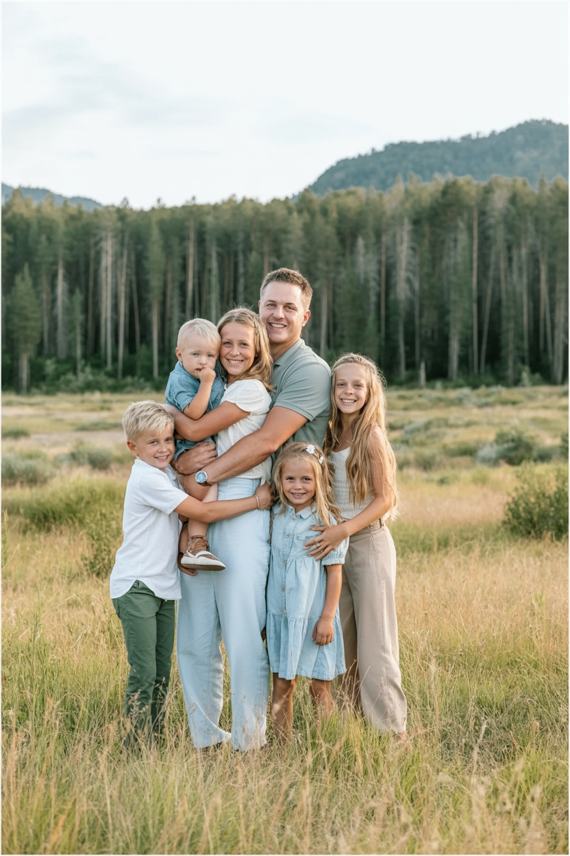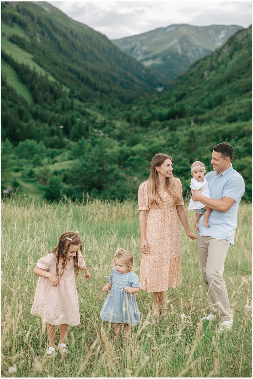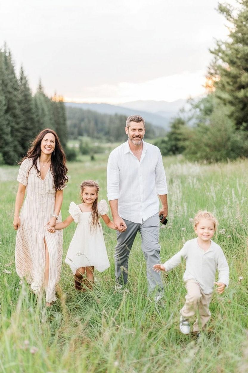 This family outfit feels strong, connected, and grounded. Green and neutral tones blend seamlessly with the natural landscape, creating a cohesive and confident family story that feels authentic.