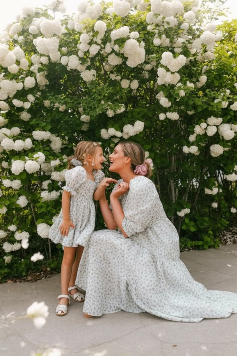 This look captures one of those tender moments every mom recognizes—closeness, softness, and quiet affection. Matching floral dresses create a beautiful visual connection while still feeling light and natural. It’s feminine without being fussy and incredibly touching.