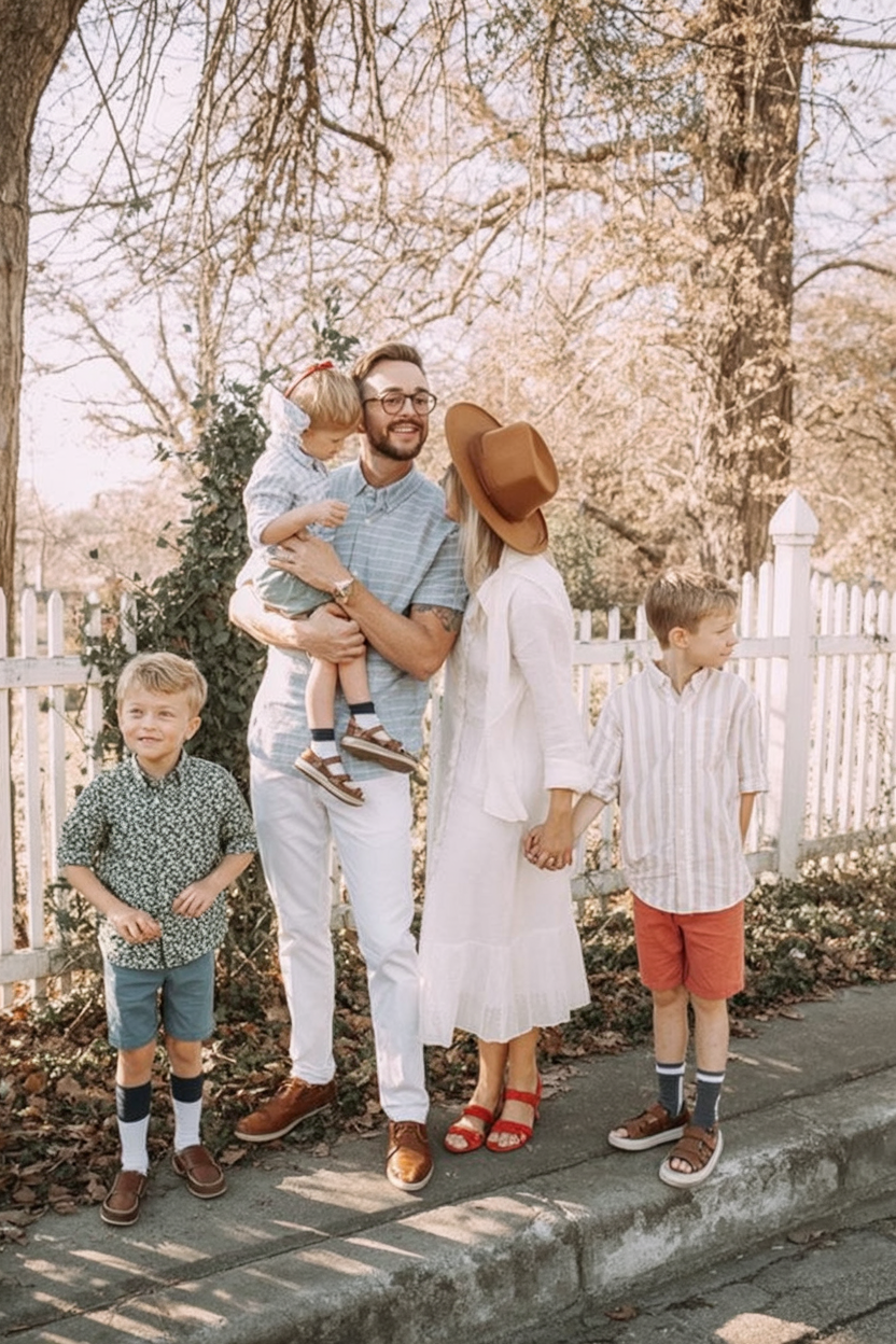 This family look feels effortlessly nostalgic, like a quiet walk through a familiar neighborhood on an early spring afternoon. Light neutrals mixed with muted green and soft textures create a warm, lived-in mood that feels genuine and relaxed. Nothing feels forced here—just real connection, laughter, and that comfortable closeness families grow into over time.