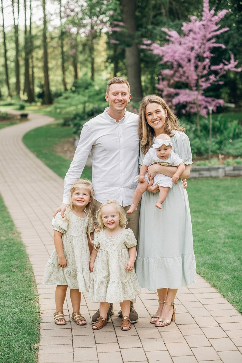 This look feels timeless, calm, and beautifully coordinated without feeling forced. Soft green dresses paired with light neutrals create a balanced family style that feels peaceful and polished. With a baby in the mix, the overall mood stays gentle and warm—exactly what spring memories should feel like.