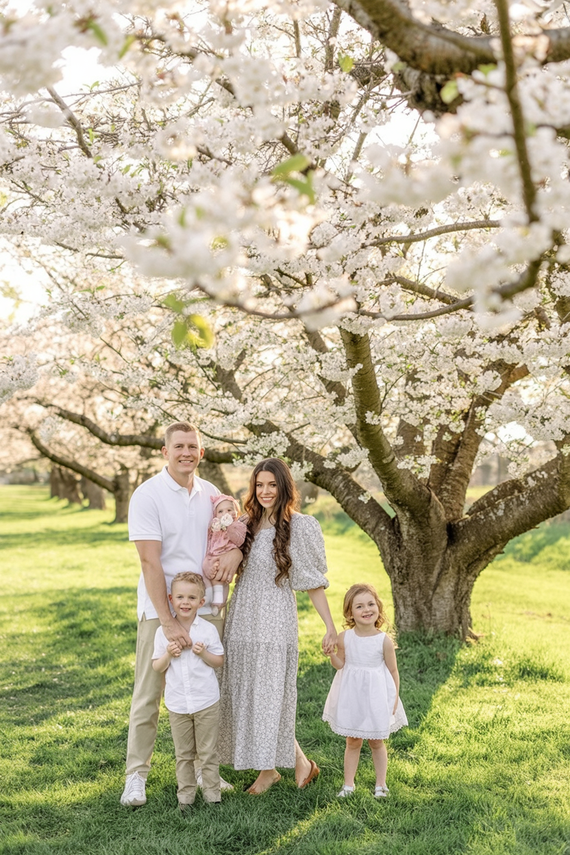 This family look feels peaceful and timeless. Soft gray dresses mixed with white create a clean, airy palette that pairs perfectly with blooming spring trees. It feels balanced, calm, and quietly elegant.
